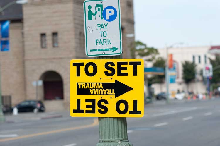 A sign on Telegraph pointing to a television series shoot in Oakland